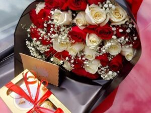 RED & WHITE FLOWER BOUQUET WITH FERRERO CHOCOLATES