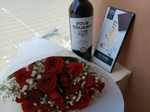 RED ROSES, FOUR COUSINS RED WINE & BELGIAN CHOCOLATE