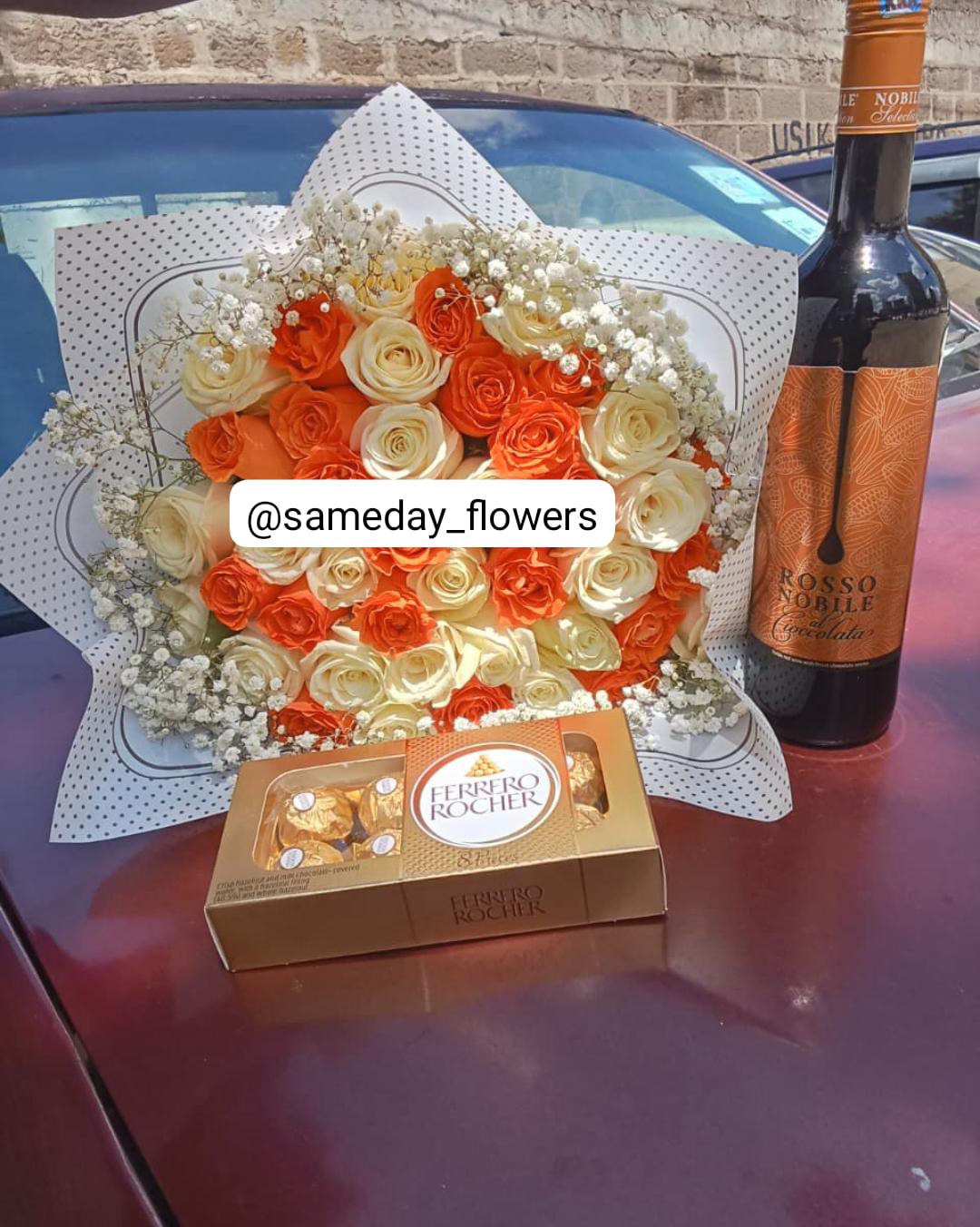 WHITE & ORANGE ROSES WITH ROSSO NOBILE WINE & CHOCOLATES