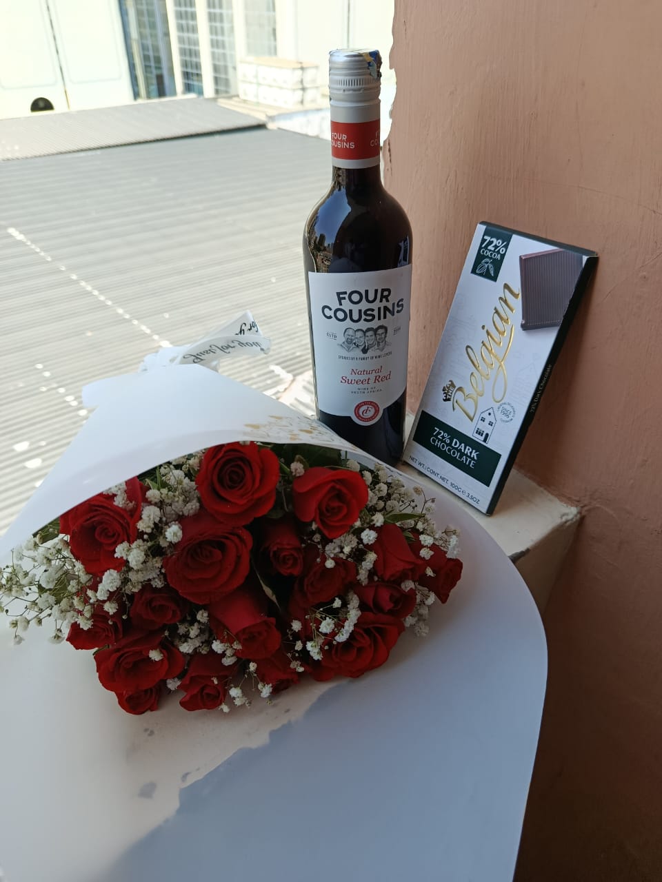 RED ROSES, FOUR COUSINS RED WINE & BELGIAN CHOCOLATE