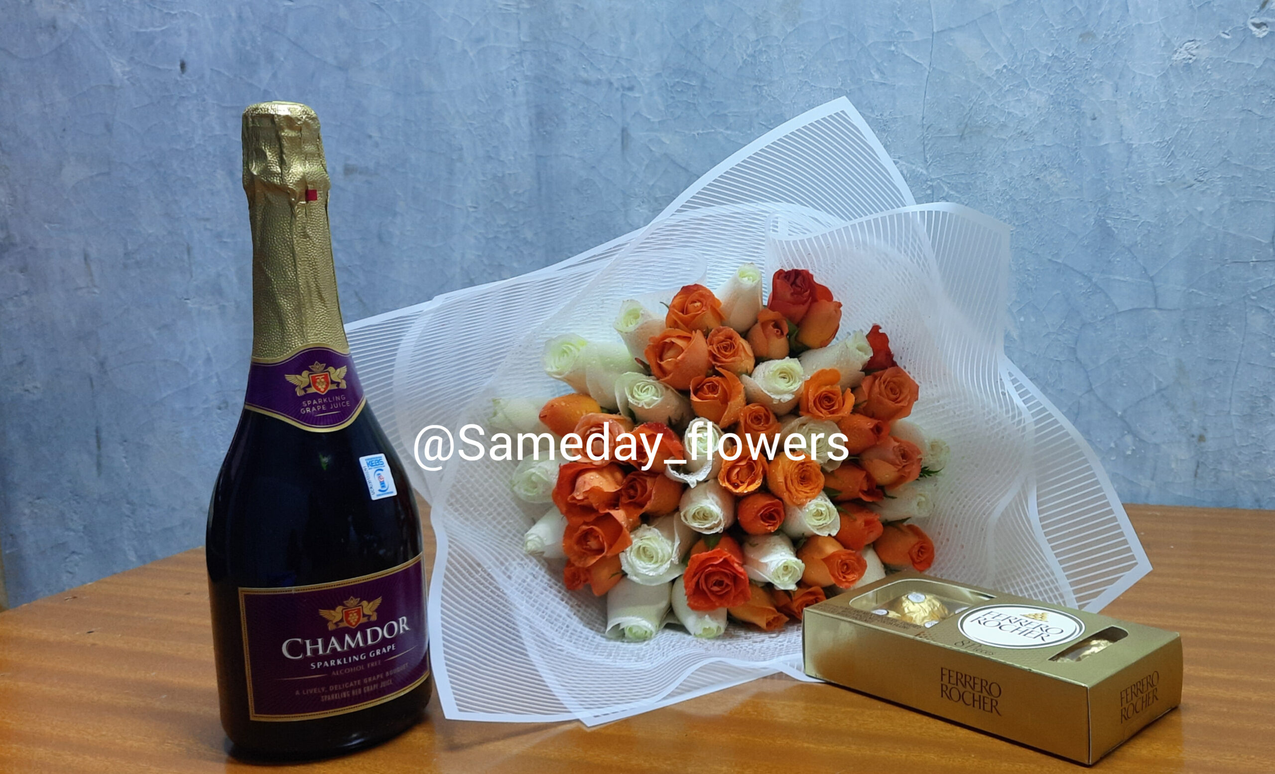 Be the first to review “WHITE & ORANGE ROSES WITH NON-ALCOHOLIC WINE & FERRERO CHOCOLATES”
