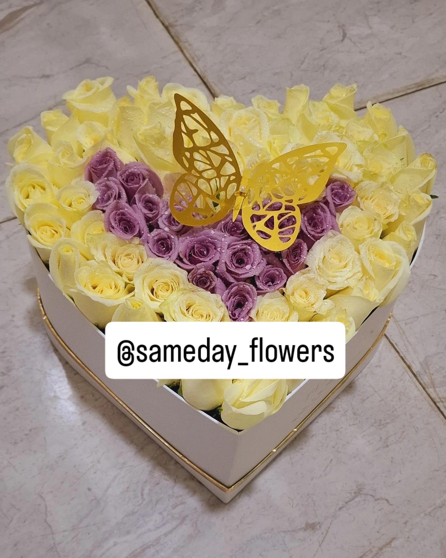 Be the first to review “WHITE & PURPLE HEART BOX ARRANGEMENT”